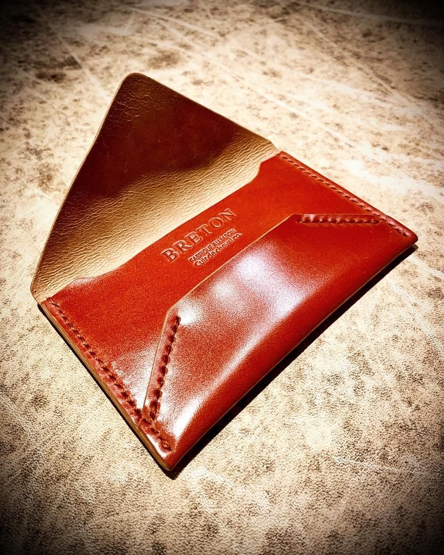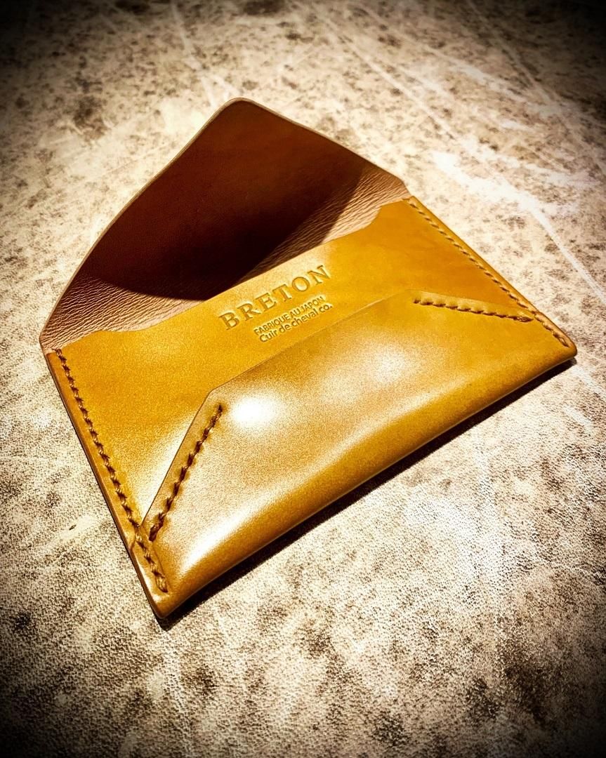 BRETONオリジナルの草木染めコードバン2種(クチナシ花・蘇芳花)を使用しております。無染色アルゼンチン馬革とはまた違った雰囲気を纏っていて、素敵な逸品に仕上がっております。ひときわ目立った存在感を放つカードケースをお探しの方にはピッタリです。