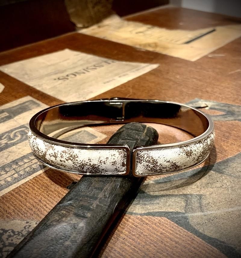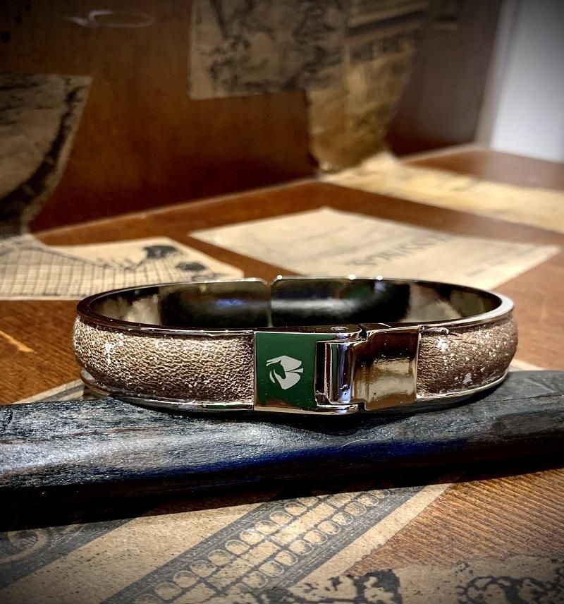 軽くてソフトな質感が特徴的なBRETONオリジナルホースレザー。特注の金型バングルに装飾することで、互いの魅力を引き立て合い、独特の存在感を醸し出しております。
